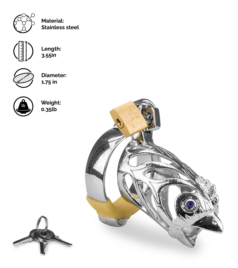 The chastity cage is 3.55 inches long and the holding ring has a 1.75-inch diameter. It comes with a padlock and a set of 3 keys.